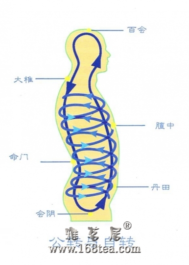 人體是一能量動力循環系統,包括自轉與公轉兩個方面,自轉,即人體每一個細胞都在進行著胞內物質與胞外能量的相互轉化,其所輻射的能量圍繞在細胞本體周圍,這種能量運行遵循一定的規律,即自左向右圍繞細胞本體運行,是橫向水平面的運行,我們稱這種能量的運行為自轉。人體的臟腑均由細胞構成的,所以,臟腑的能量也都圍繞臟腑本體進行自左向右的運行。公轉,即人體內能量的高度集中統一運行,從傳統中醫的穴位與經絡概念來講,公轉的運行路線如下:能量從會陰向上走,經丹田、中脘、膻中、天突、到達百會,向後方下行,經啞門、大椎、命門、過尾閭至會陰,再轉向前方上行,循環往復。
