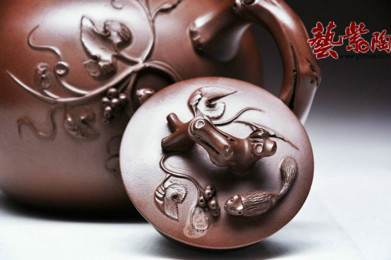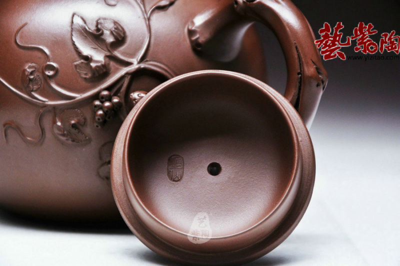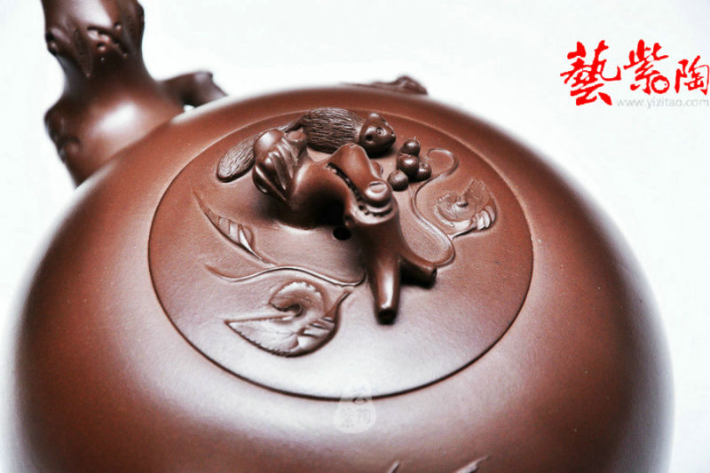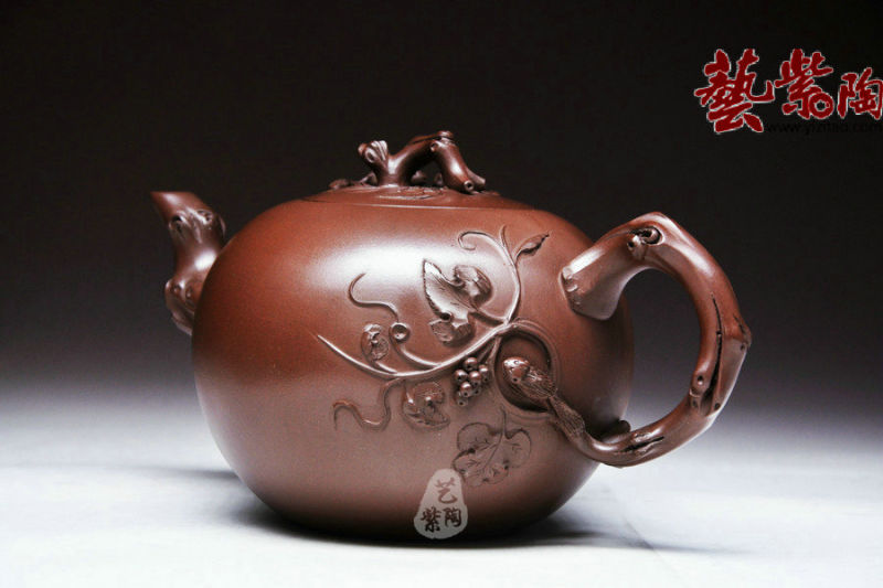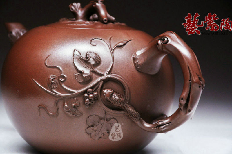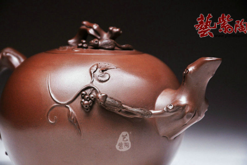 精品原矿老紫泥泥料制作的“松鼠葡萄”壶,枝叶藤蔓舒展,浮雕贴花装饰美妙,赏壶间仿佛飘来了果熟秋香,一把“松鼠葡萄壶”坚守紫砂正道,布局巧妙,精到精致,松鼠灵动可人,葡萄鲜亮欲滴,重演传世经典。 壶把、壶嘴与的子为千年古松,枝干苍劲、凌霜不凋而蓄势待发;壶身浑圆饱满,如中秋皎月,人月俱圆,星星点点之碎金,如苍茫夜空,繁星闪烁,又如黄花匝地,纷纷扬扬;此乃紫玉金砂肌理所现,而非人工点缀,温而不火,润而不涩,稳如古 玉,质朴典雅;壶上几片嫩叶,青翠欲滴,松间几串葡萄,醉香诱人;融堆、贴工艺于一体,凸现浮雕质感,极具造型功力,枝头几只松鼠,或引颈眺盼,或翩然起 舞,活灵毕现,呼应成趣。