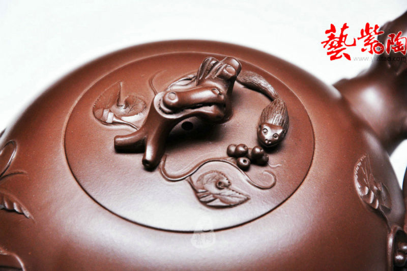 ▼壶盖布局巧妙,松鼠灵动可人,葡萄鲜亮欲滴,树桩为钮,自然古朴