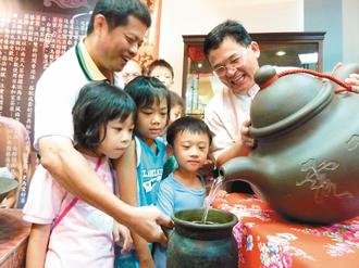 彰化市长邱建富、收藏家陈鸿洲和小朋友们把玩14公斤重的紫砂壶大茶壶,并示范炒菁,让小朋友体验传统的茶艺文化。