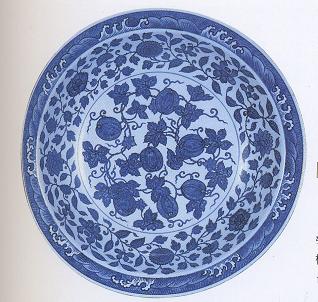 盘口径45cm,折沿,弧腹,平底。沿面上绘起伏的海涛纹,严谨有序,一丝不苟。盘外壁用青花饰枇杷、石榴、樱桃、桂圆、荔枝等折枝花果,盘内腹饰有8朵盛开的菊花、牡丹、月季等缠枝花卉,平坦的盘心为中国传统的吉祥图案——“瓜绵图”,取世代绵长之意。(石皓)