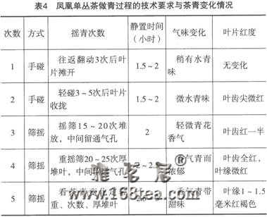 (一)凤凰单丛茶加工凤凰单丛茶为历史名茶,创始于明代,原产潮安县凤凰镇,是以凤凰水仙群体种中的优异单株品种(系)的鲜叶为原料经单株采制而成的高档产品。1.凤凰单丛茶的品质特色凤凰单丛茶品质极佳,其挺直肥硕油润的外形特色,优雅清高的自然花香,浓郁甘醇的蜜韵风味,橙黄清澈明亮的汤色,青蒂绿腹红镶边的叶底及极耐冲泡的底力,构成了凤凰单丛茶特有的色、香、味内质特点。2.品质形成的关键技术及其控制凤凰单丛茶的鲜叶采摘标准以新梢形成对夹后2~3天为宜,茶青不可太嫩,也不可太老。凤凰茶制作流程包括晒青、凉青、做青、杀青、揉捻和烘焙6道工序。(1)晒青。晒青宜下午16: 00~17: 00进行,将鲜计均匀薄摊于竹筛中,以叶片不重复为适度,在气温22~25℃的条件下,用阳光晒青15~20分钟。晒青以叶片由原来鲜绿有光泽转暗绿萎软,失水10%~15%为适度。气温高于28℃时不宜晒青。(2)凉青。将晒青适度的鲜叶移入室内竹筛上摊晾,厚度约3厘米,凉青时间为1.5~2.5小时。(3)做青。做青工艺分为用手碰青和人工筛摇两种形式。应根据天气、场所和鲜叶质量的实际情况灵活操作,实行"看青做青"与"闻青做青"相结合。碰青过程要坚持用力先轻后重,次数先少后多,静置时间由短渐长,鲜叶摊放逐次增厚的原则。每筛盛放凉青叶2~3千克,手工做青操作过程的技术要求及茶青理化变化如表4所示。 做青适度标准:约有70%叶片达到“二分红八分绿”(绿腹红边),叶成汤匙状,闻之香气浓郁带甜味。摇笼做青操作在凉青2小时后进行,第1次摇青时间为1分钟,每分-钟16~18转。每隔2小时摇1次,共5次。摇青时间每次递增1分钟,每次摇青后须将笼内鲜叶松翻摊开静置。(4)杀青。在完成做青工序后2~5小时内,应灵活根据鲜叶的香气转化程度及时进行杀青。杀青有采用电动爪齿式杀青锅、电动滚筒式杀青机和手工杀青等方法。杀青投叶量和杀青时间根据杀青机械和锅温高低灵活掌握。高档茶提倡手工杀青,锅温100~130℃,先扬炒后闷炒再扬炒,杀青时间10~15分钟。杀青以鲜叶变得柔软有黏手感,茶梗折而不断且有清香味为适宜。(5)揉捻。将杀青叶摊开,消散部分热气、水汽,趁温热投入揉捻机揉捻。加压程度按“轻一重一轻”操作,揉3~5分钟后,出桶解块理条,用双手捧茶坯甩成较直条索。(6)烘焙。采用竹制焙笼地炉烘茶或热风焙炉烘茶,也可采用手拉式烘干机或自动烘干机。提倡炭炉烘焙,多次烘 焙。第1次烘干温度95℃,每焙笼投叶量0.2~0.3千克,烘至 五六成千后摊晾;第2次烘干温度80~90℃,投叶量为初烘茶的2倍,烘到八成千后摊晾;第3次烘干温度60~70℃,投叶量为二烘茶的两倍,烘至九成半干后继续摊晾;第4次烘干温度50~60℃,投叶量2~3千克,烘至足干即成毛茶,摊晾后:密封贮藏。毛茶足干要求:干嗅有清香,茶梗折之即断,叶片捏之成末,含水量≤7%。岭头单丛茶的品质特征与凤凰单丛茶相近,因此其加工工艺技术可参照凤凰单丛茶执行。广东盛产的大叶奇兰、西岩拖种可参照上述工艺技术要求,通过适当调整做青次努和时闯来进行加工。(二)颗粒形乌龙茶加工颗粒形乌龙茶,其鲜叶品种一般是中小叶乌龙茶品种,如西岩乌龙、台湾金萱、翠玉、铁观音、黄观音、金观音等。下面以台湾金萱乌龙茶为例,介绍颗粒形乌龙茶的加工工艺技术。1.鲜叶采摘最好在天气晴朗的条件下采摘,避免采雨水叶、露水叶和在中午强光下采摘。一般采摘时间为上午9:00一11: 30和下午14: 30一16: 00。采摘标准为小开面二、三叶为主。茶青的完整与否与茶叶的品质密切相关,采摘过程不能损伤叶片。2.晒青晒青时将鲜叶均匀摊放在晒青布或竹席上,厚度不超过2厘米,晒青时间根据光照强度不同,一般为15~30分钟,晒青以叶质变软、叶色转暗、挥发出青草气、失水约8℃为适度。3.凉青茶青晒青结束,将晒青叶摊放在竹筛上,置于凉青房凉青,此时茶青摊放厚度3-5厘米,凉青房控制相对湿度约70%,温度20~24℃。4.做青分3次做青,第1次用手轻碰,时间约30秒,然后摊放在竹筛上,在凉青房内静置约2小时;第2次把鲜叶放在摇青笼内摇青3分钟;间隔3小时后再摇第3次,此次摇青7分钟。将摇青后的鲜叶放在竹筛上静置10~20小时,摊放厚度不超过3厘米。做青适度的标准是叶边缘有少量变黄或微红,叶片返活,清甜花香显著。5.杀青用6CB-80×160型液化气式滚筒杀青机杀青,杀青温度250℃,杀青至含水量35℃为适度(此时叶片手摸感觉比较干爽)。然后将杀青叶堆起放置1小时,使茶坯摊青回水。6.做形(包揉)用茶巾(规格为1.5米×1.5米)将杀青叶包起。每包约17千克,通过6CWBR乌龙茶束包机反复包揉和解块,把杀青叶包成颗粒状的毛茶。整个做形过程以“束包一包揉一解块”称为1次做形,共做20次以上,期间经解块、机烘(温度110℃)后再包揉2~3次,每次烘至失水5%~6%。最后一次做形必须把茶坯束包3小时以上,到茶颗粒圆紧、碎末少,方可解包干燥。7.干燥将包揉做形好的茶坯用毛火90℃烘至含水量5%~6%,便形成了毛茶。8.拣剔去粉末把毛茶筛去粉末,然后人工或机械(自动色选机)拣去黄片或茶梗。9.复烘、装箱把经过拣剔后的茶叶,经110℃复烘90分钟,摊晾后装箱入库。